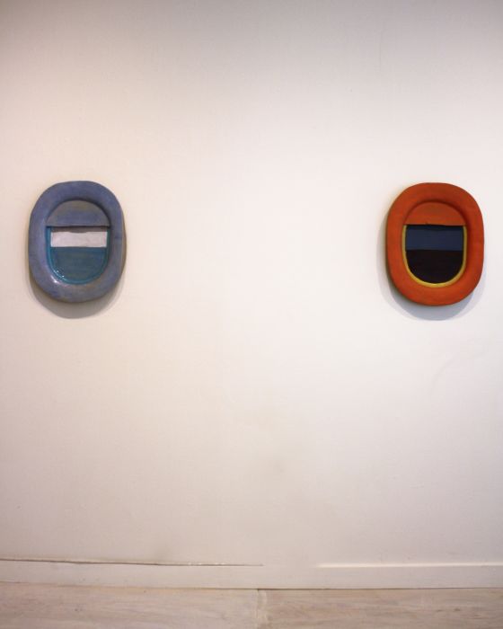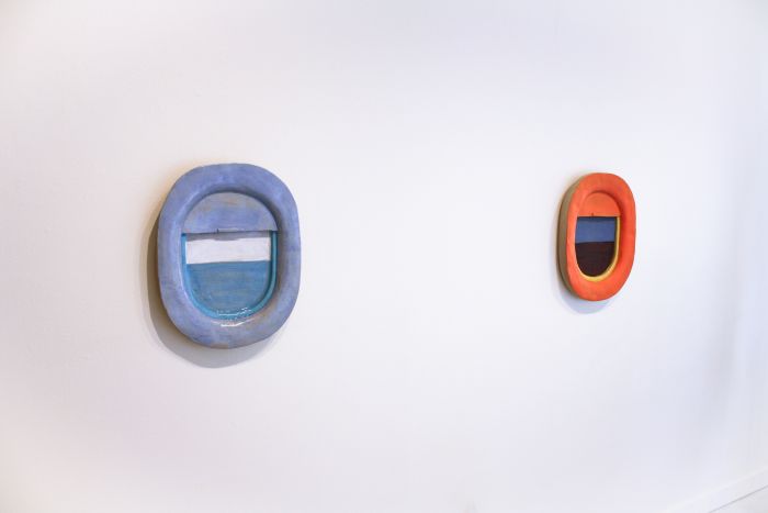 For the August 2025 Art Murmur, Johansson Projects presents Window Seat, a solo exhibition by sculptor CJ Chueca. Chueca’s ceramic airplane windows transport the viewer into the liminal space of the skies. Spare titles indicating row and seat number correlate to different points of view. The windows vary in relation to the rhythms of the day– some dark mimicking a shadowy red eye flight, another orange as if illuminated in a fleeting golden moment, and yet another white as plain day. These hand-built ceramic forms are as materially fragile as the transitional experiences Chueca alludes to, drawing on tactile and visual memories of peering out an aerial porthole. Referencing her own experiences of migration between Mexico, Peru, and the United States, Chueca’s windows blur geopolitical borders and the emotional dimension of transition.