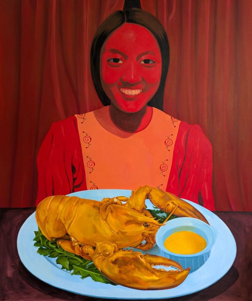 Eating, in these works, becomes a fraught and complex act—both intimate and performative, pleasurable and punishing. Across the paintings, consumption is never neutral: it is a site of desire, excess, control, and projection. Whether through the hyper-aestheticized table settings, the impossible quantities of food, or the emotional distance of the figures, the show explores how what we consume (food, culture, images) shapes our identity and how this ties into broader philosophical ideas about self-construction and the influence of external factors. While inspired in part by the sensory overload of mukbang videos—with their exaggerated intimacy and spectacle—the paintings also echo more everyday rituals: the loneliness of solo dining, the choreography of a formal meal, or the pressure to eat “correctly” across cultures. Drawing on Kyla Wazana Tompkins’ notion of “indigestion” as a failure or refusal of incorporation, Wu asks what it means to consume, or to be consumed, in a world where appetites are always being shaped by race, gender, class, and the gaze of the viewer.