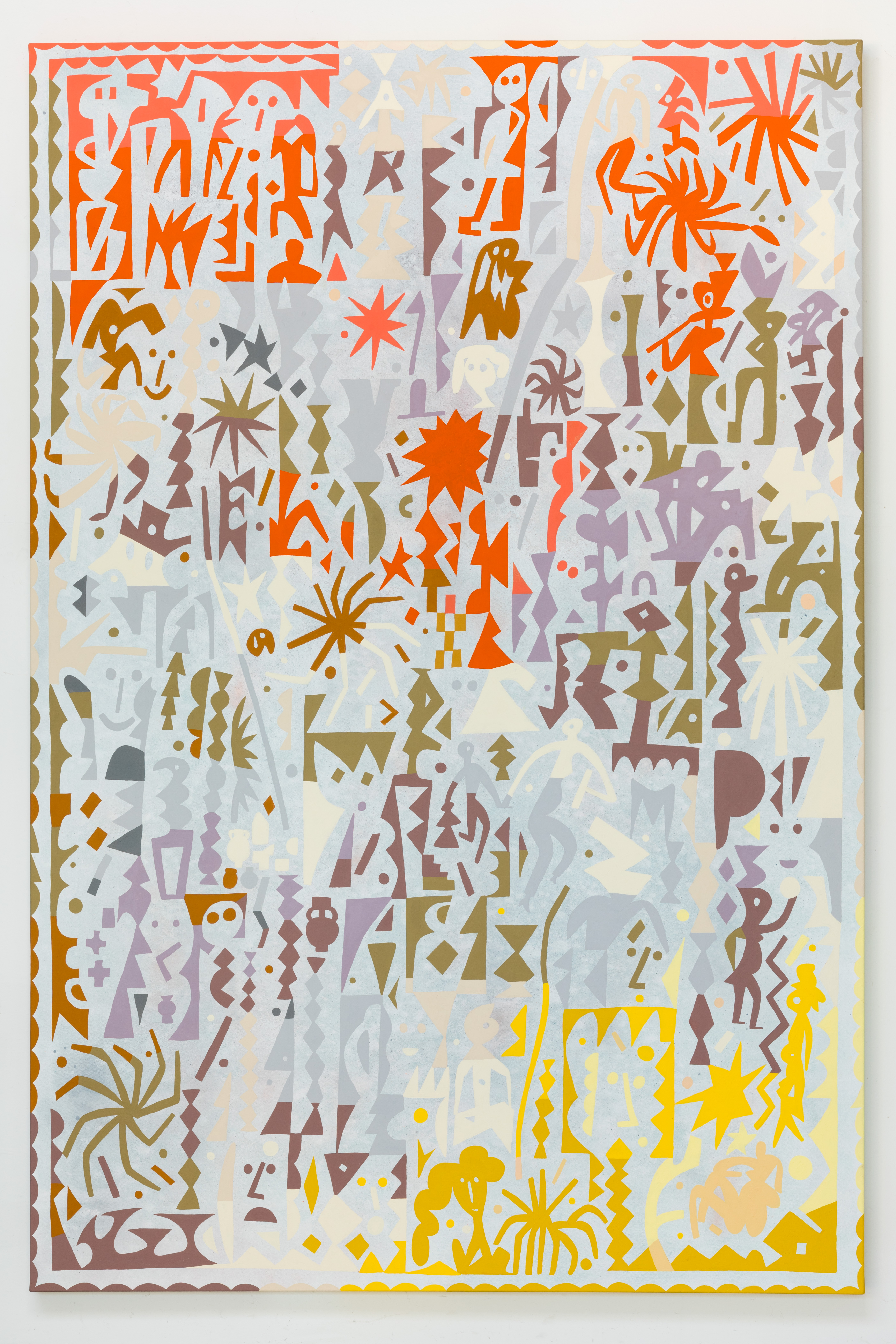 While this close-ness is front and center in Kaye’s waxy colored pencil drawings, Girard’s communal patterns retain an anthropologic distance. They look in on a make-believe landscape of make-believe palm fronds and make-believe humans, spinning ancient tales with modernist dance moves. Precise as woodblocks, Girard’s paintings nod to the design work of his legendary grandfather, Alexander Girard, while refusing to be still, vibrating in primal clay and blue and black pigments.