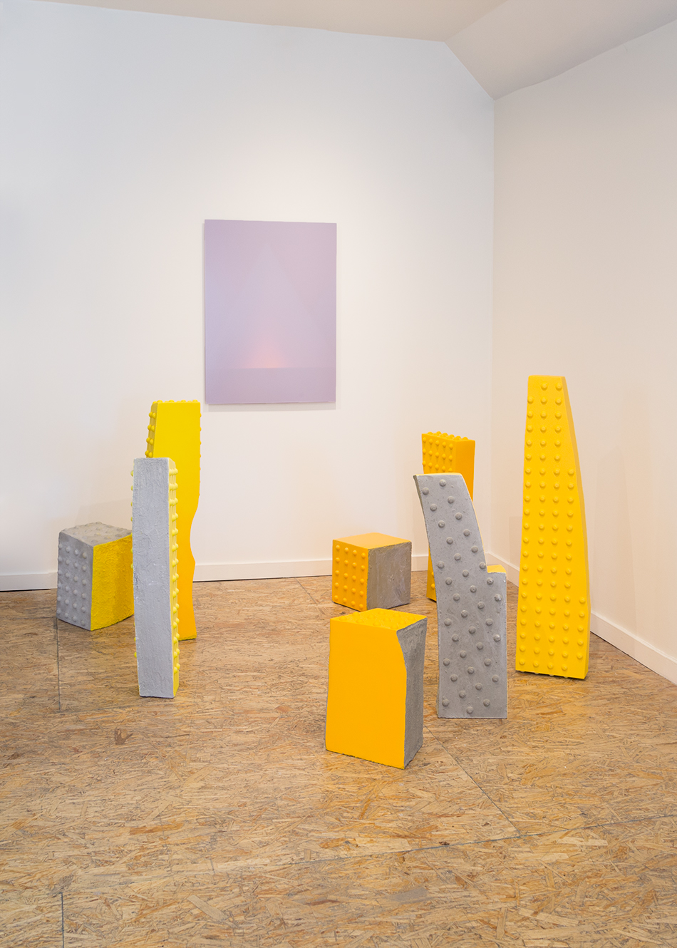 For Bussières, the lumen print process allows her to layer colored light exposures of cut shapes to build a glowing geometric presence. She considers the light of specific geographical locations when creating. In the darkroom, in the studio and outside, her shapes are manipulated, overlapped or aligned, to create records of sculpted moments. The dusty pinks and lavenders regress next to glowing yellow shapes, akin to lunar moments viewed through architecture. The photograms radiate next to Sennish’s concrete sculptures which stand as silent urban monuments. Her sculptures are made of familiar textures and materials that become symbols of our constructed landscape. She stacks, puzzles and combines moments recorded during her city walks. In her work, our relationship to nature within the built environment is recorded as a single tree shadow.